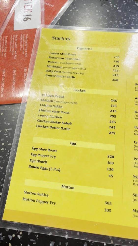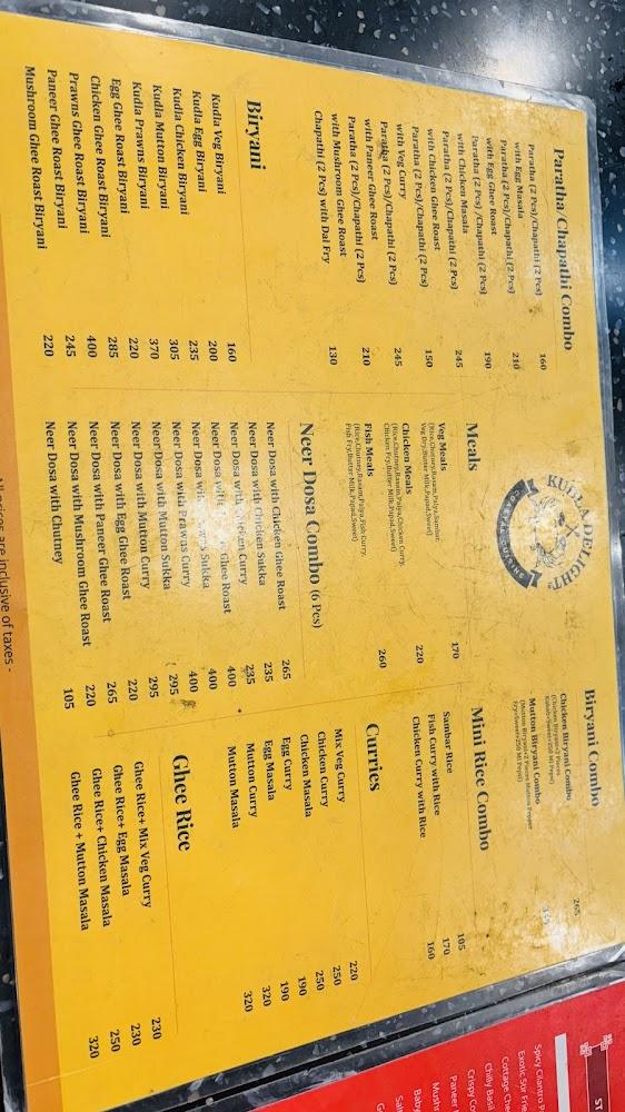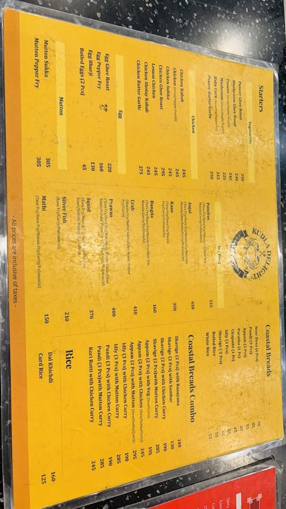 Kudla Delight features a diverse menu focused on seafood, offering scrumptious options that reflect Karnataka's coastal cuisine. The extensive selection includes 39 seafood starter plates alone, such as the Anjal Ghee Roast and Bangda Bale Yele Masala—both must-try dishes that showcase local flavors.